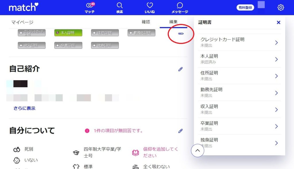 証明書が提出されていないと、異性から怪しまれてしまいます。 最低でも本人証明とクレジットカード証明はしておきましょう! 証明書の提出もマイページの編集から登録できます。