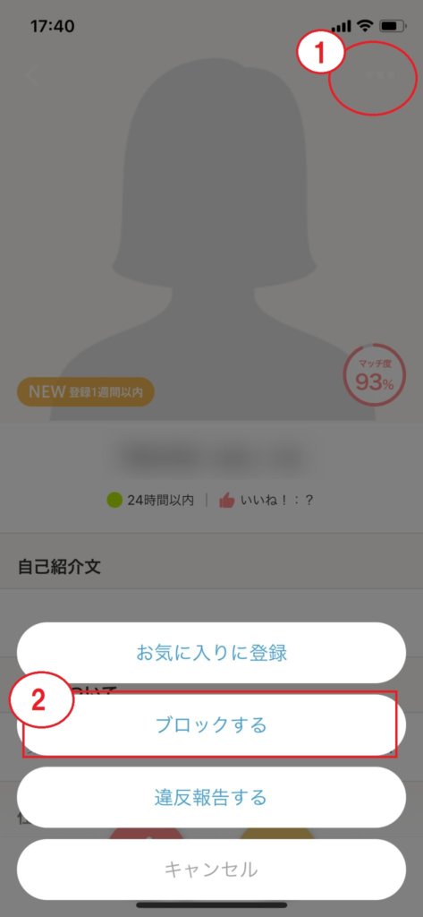 相手のプロフィール右上にある「・・・」をタップすることで違反報告できます。 Omiai違反報告