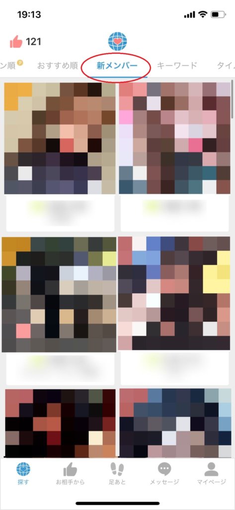 そんなときは「新メンバー」検索がおすすめ。新メンバーは写真を設定していない方が比較的多いですし、ライバルも少なくマッチングしやすいです。 新メンバーは、「探す」画面の上部から選択できます。