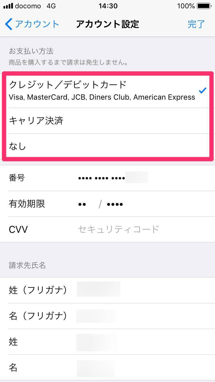 ここで「クレジットカード/デビットカード」や[キャリア決済]にチェックを入れれば、iTunesカードからの残高が尽きた後に選んだ方法で不足分が決済されます。 「なし」にチェックを入れれば、勝手にカード決済やキャリア決済が行われることはありません。